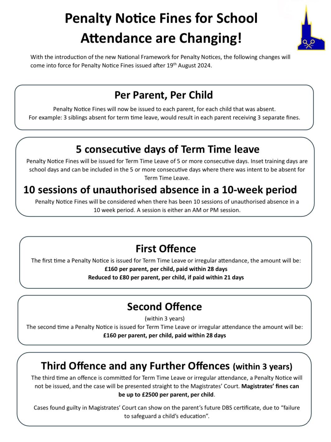 From August 2024 the government is introducing new rules that will increase the amount of money parents who are fined for taking their children out of school will need to pay - with County Councils expected to apply the measures comparably and consistently (under the current rules it is the responsibility of the local authority to decide when to issue fines to parents - which means the process can vary from council to council across the country). Please be prepared for a far stricter approach/enforcement by our Local Authority come September onwards.