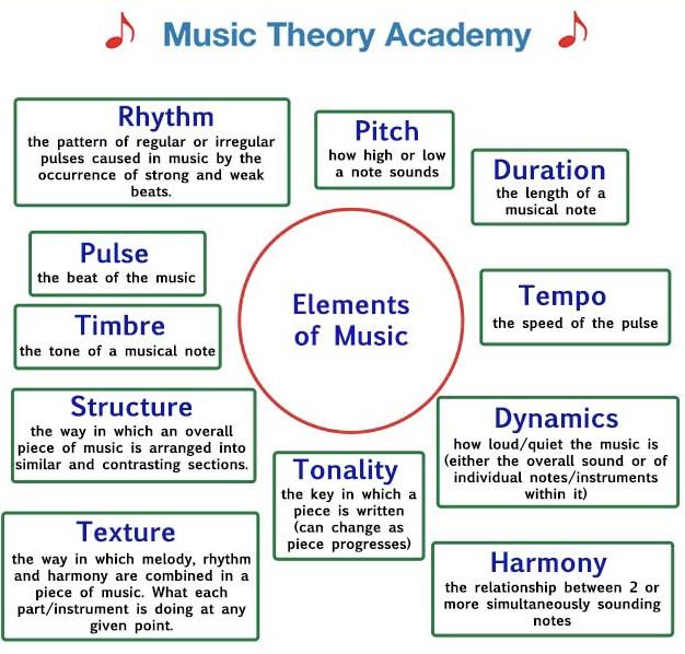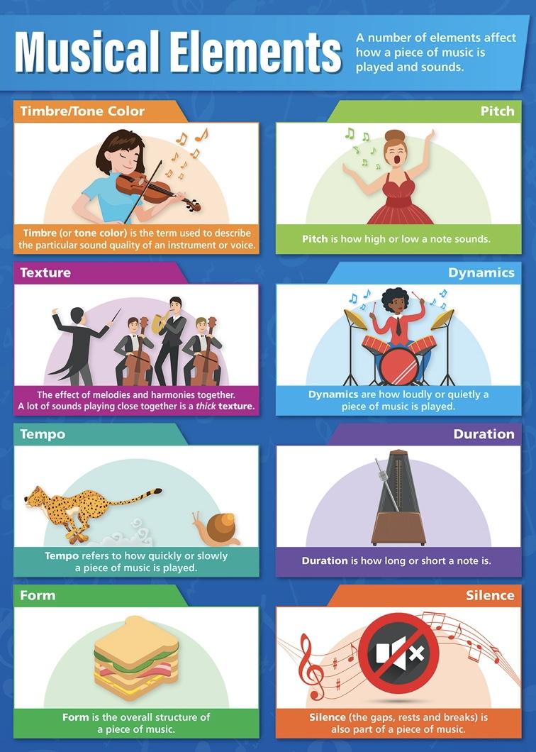 - reflect on music listened to and discuss its parts using terms such as pitch, duration, timbre, dynamics and texture;