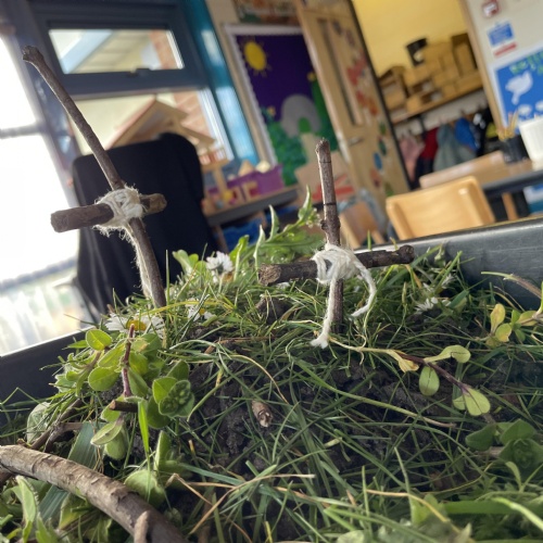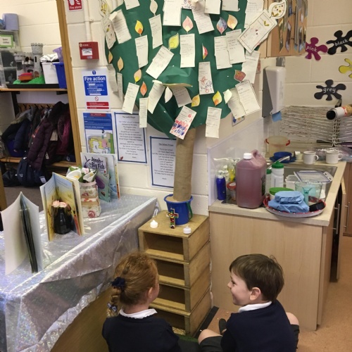 Children are introduced to Religious Education in the Early Years through learning about celebrations and festivals. This links with the Early Learning Goals of comparing similarities and differences between themselves and other people in the community. In addition there is opportunity for listening to a variety of stories with a key religious or moral focus (E.g The boy who cried wolf, the parable of the lost coin). Children have the opportunity to retell stories they have heard, through role-play and small world within the classroom environments.  Early Years Practitioners use observation to assess children’s understanding of celebrations and festivals through conversations with the children and how these are linked to their own lives and family circumstances.